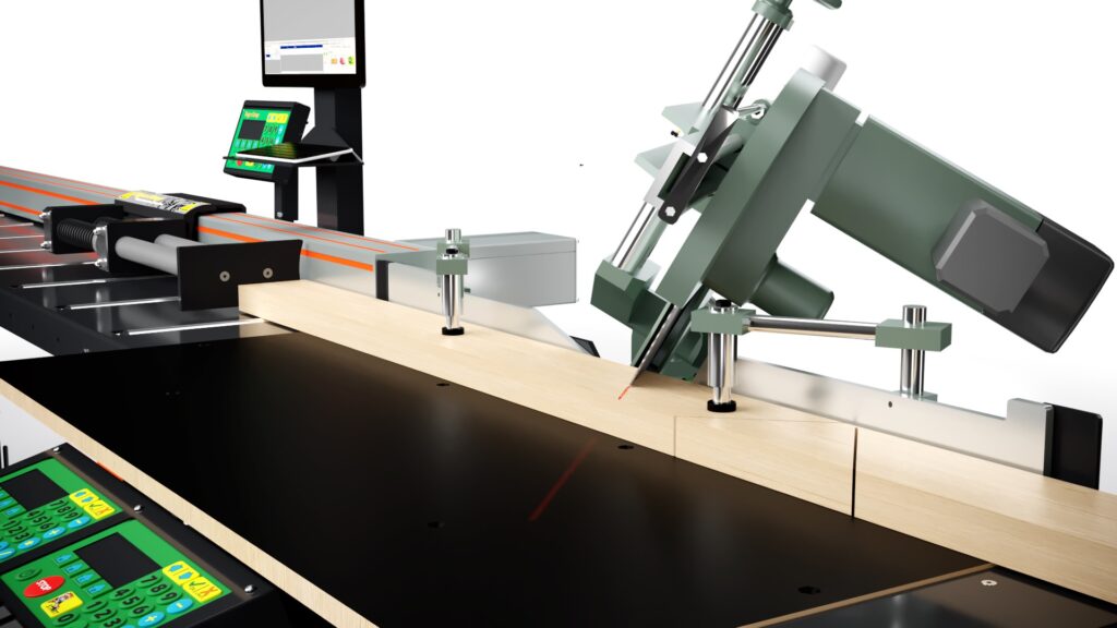 Il est aussi possible de travailler en butée, l’opérateur pousse le bois contre la butée puis entre les angles sur les pupitres pour que la machine s’oriente automatique aux angles demandés.